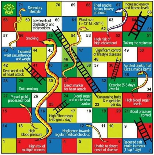 Start at the bottom – Roll the dice – move along how many points – land on a snake’s heat = go to its tail – land on a ladder to climb up – first to the top wins