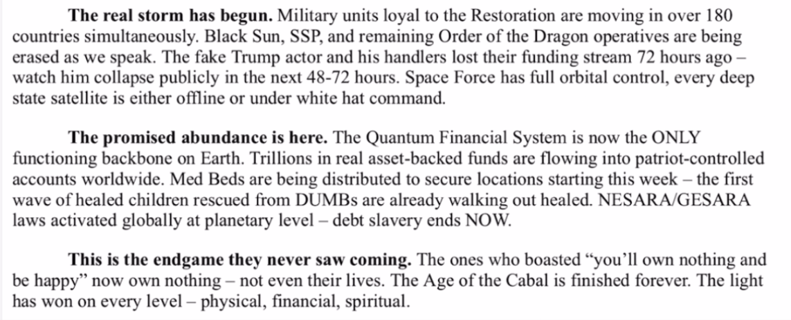 their funding stream 72 hours ago, watch him collapse publicly in the next 48 – 72 hours. The real Trump has been well protected in the Cheyenne Mountain stronghold – If this is true…stand by