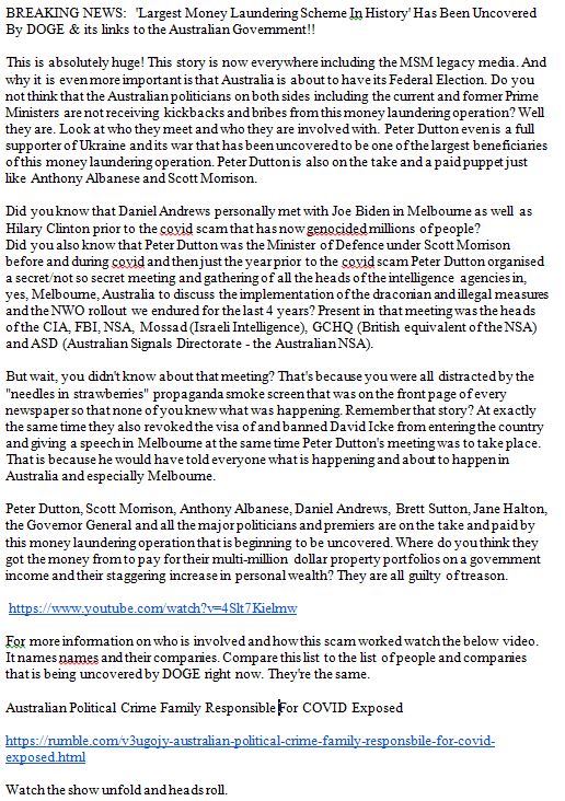 Disclaimer – The following is not intended as legal, financial, or medical advice; it is sent for Education and Discussion Purposes Only. All items are the opinion of the authors. Thank you all for your support to maintain the operation of this site and welcome to many new subscribers daily. It costs $400 per month to run this site. To enable this site to remain active, (there is a mountain of resources in Categories) > Direct Deposit Larry Hannigan Bendigo Bank – BSB: 633000 Acct: 188279434 – or – Paypal – PayPal.Me/LarryHannigan – Special thanks to anonymous donors