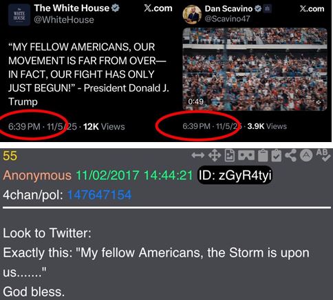 Dan posted a video beginning w/ “My Fellow Americans”, at the same time, The White House made a post with that same quote from the video. 6:39 = 1839. Drop 1839 is a military stringer. And of course, Drop 55 is the famous “My Fellow Americans, the Storm is upon us” drop.