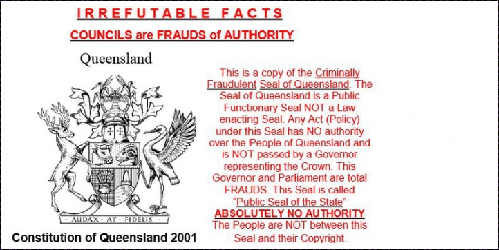 This is a copy of the Criminally Fraudulent Seal of Queensland. The Seal of Queensland is a Public Functionary Seal NOT a Law enacting Seal. Any Act (Policy) under this Seal has NO authority over the People of Queensland and is NOT passed by a Governor representing the Crown. This Governor and Parliament are total FRAUDS. This Seal is called “Public Seal of the State” Click on the image to read more (download pdf)