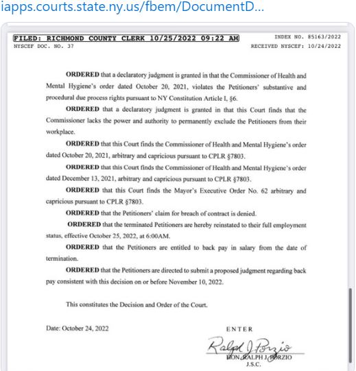 NY State Supreme Court reinstates all fired unvaccinated employees, orders back pay, says the state violated rights, acted arbitrary & capricious, notes:“Being vaccinated does not prevent an individual from contracting or transmitting Covid-19.”